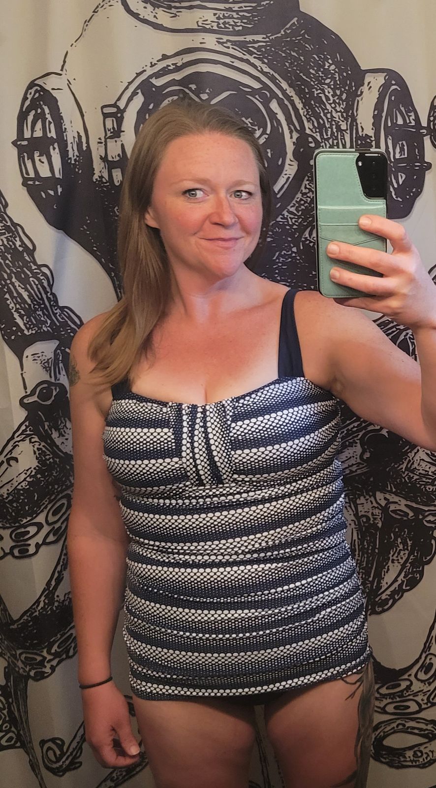 I love the fit and the shape of this top. I am busty and I feel perfectly covered and supported in the water and out. The fabric is substantial. I am a womans in her late 60’s and feel pretty in it.
