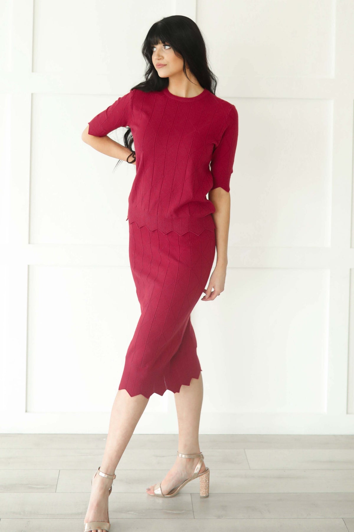 This exclusive sweater set is perfect for all seasons! Offers a light soft knit fabric that has stunning details not found in other sweater sets. This set has scalloped details on the sleeve & the bottom of the sweater top and skirt. Unique knit diagonal designs with thin knit stripes that offers a flattering fit for all body shapes! Available in Holly Berry and Indigo Blue.