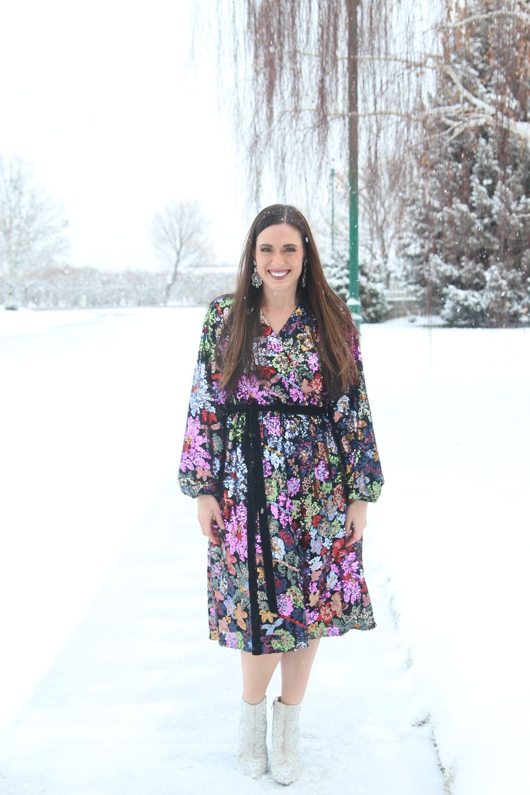 Our Danica is a timeless show stopper! Sparkles day or night! Decorated with handmade lustrous sequins creates a beautiful finish! Our Danica features exquisite floral artwork that makes this dress not only an original, but truly magical! Soft, buttery lining, faux wrap design, with a black velvet tie at the waist sets this dress as stunning! Never seen before this DM original is a dress that will make you feel like a million bucks! A comfortable and flattering fit for all body shapes! As you know, that is the DM way of designing! Enjoy!