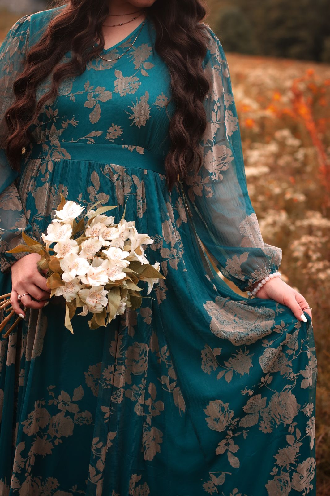 Our Adoria Maxi dress is just one of kind! A true statement piece that will not be found in any other store! The Exclusive velvet floral design is etched onto the soft netting fabric that offers a forgiving and extremely comfortable fit with a little more stretch if needed!  A flattering silhouette sweeps the floor with a flowing skirt that will make people stop and stare! This dress is perfect to make a stunning entrance for bridesmaids, mother of the bride, wedding attire, family photos, date night, vacations, or for a night on the town! You will feel spectacular in our Adoria!