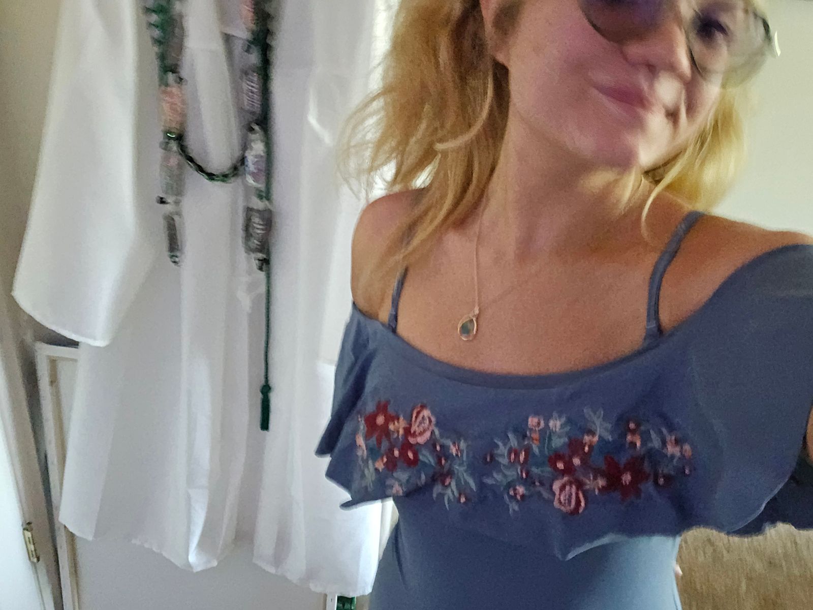 Off The Shoulder Ruffle One Piece - Ash Blue Embroidery Floral - FINAL SALE