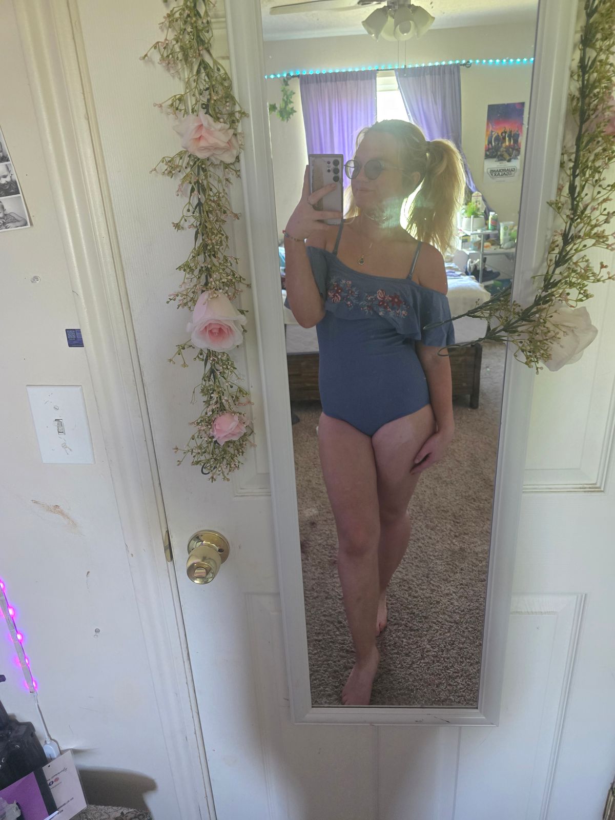 This suit is my new favorite! I swam vigorously in it and it stayed in place. I got compliments and admiring looks while wearing as well, but most importantly, I felt good while wearing it. The embroidered flowers are a thoughtful touch and the blue color is rich. The lining pulls in all the undulations that one prefers to keep hidden, too. It is hard to find a perfect swimsuit at an affordable price. So glad I got this one!